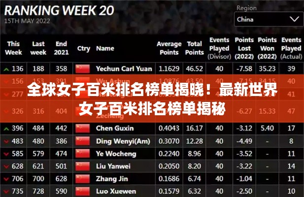 百米赛跑是一项考验速度与爆发力的极限运动,历来备受关注,而在全球范围内,也有着众多优秀的女性百米选手,她们在赛道上展现出了惊人的速度和力量,本文将为您介绍全球女性在百米赛跑领域的排名情况。